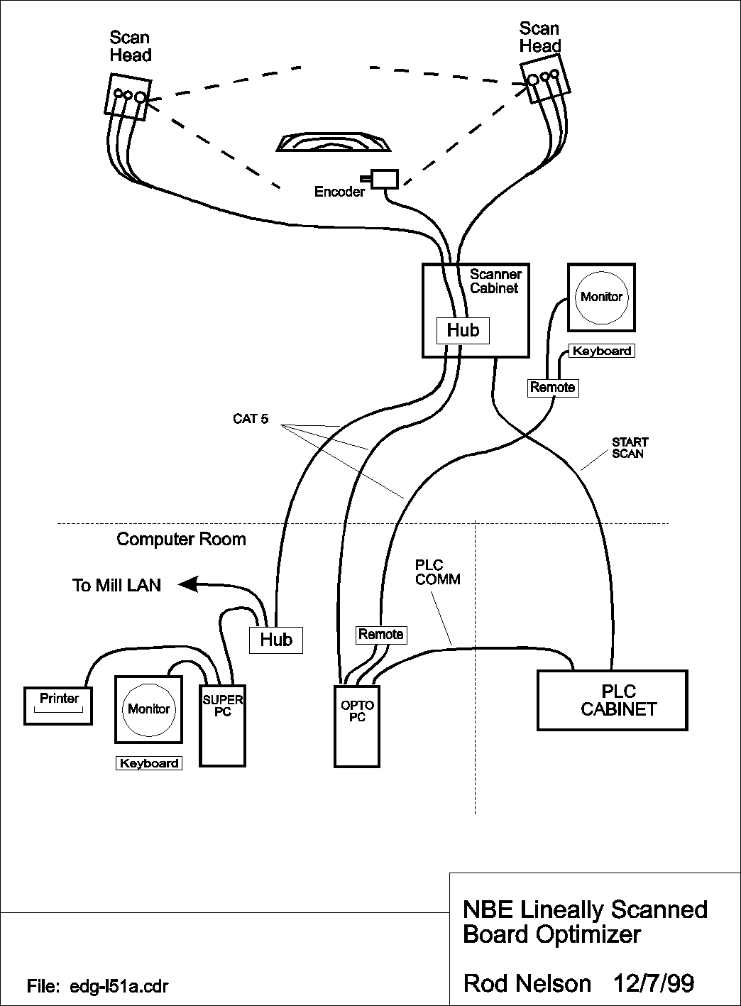There are two basic methods of scanning boards. One is the Transverse Scanner where the cant travels laterally thru a scanner that spans the length and thickness of the cant. Two is the Lineal Scanner, where the board travels lineally thru a scanner that spans the width and thickness of the board.
