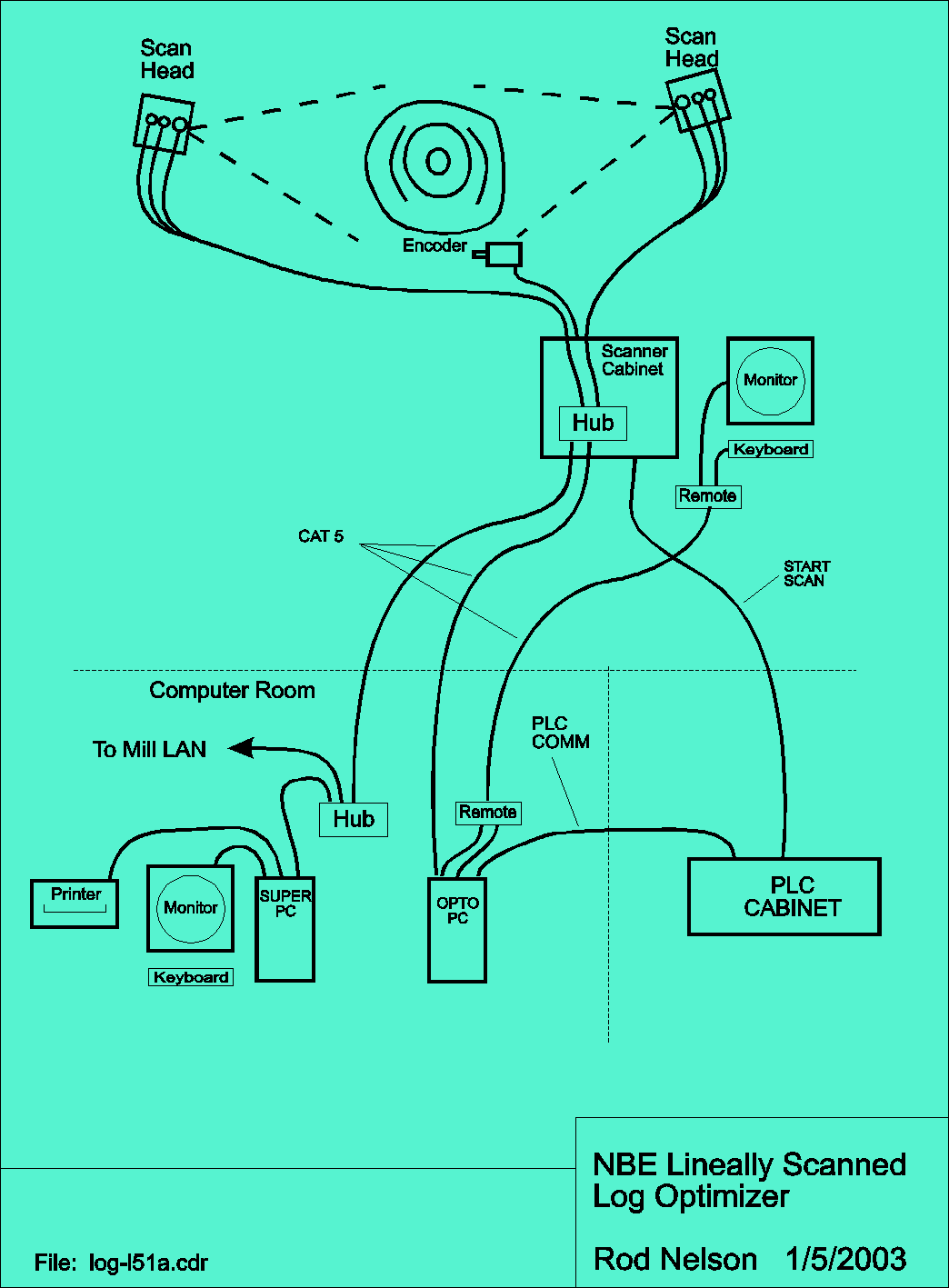 The following block diagram is for a lineal board edger, but the same diagram works for lineal cant optimizers and lineal log optimizers. The system hardware is truly identical! The optimizer computer is networked to the scan heads and to the supervisor's switching hub. The switching hub allows multiple monitor computers to display the optimizer solutions or get reports without any burden on the optimizer's network.
